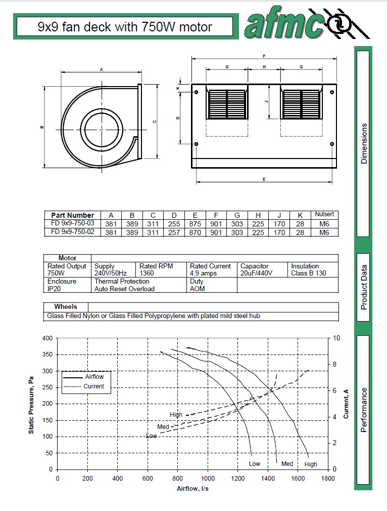 9x9 'standard' fan deck fitted with 750W 3 speed 4 pole PSC 240V 50hz motor. Supplied with P2 rated capacitor.