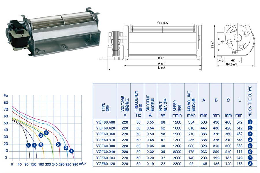 Compact design with wide air outlet, high air volume, compact structure, low noise, high temperature resistance and low vibration.